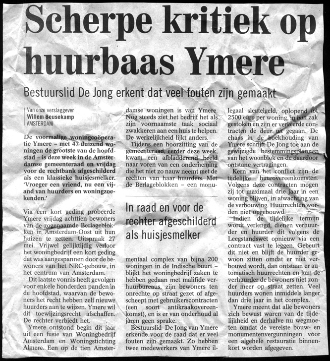 - Scherpe kritiek op huurbaas YMERE (Volskrant 15 mei, PDF, 166k)