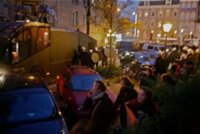 V den odjezdu se ale růžovoučký a víceméně nekonfliktní obrázek amsterdamské scény zakalil. Před několika dny obsazený byt v jednom z domů na Vrolikstraat byl prohlášen za nelegálně obsazený prostor a policie prohlásila, že obyvatele a obyvatelky vystěhuje. Čekáme na rohu ulice hodinu nebo dvě, stmívá se, moc toho není vidět, nakonec přijíždějí policejní antony, deset exemplářů, k tomu ještě vodní dělo, robokopové s obušky zatarasí ulici a vytlačí asi dvě desítky protestujících. Původně mi nahánějí strach, ale když je vidím před sebou, obličeje v legračních bílých helmách s kulatými štíty, některé jsou postříkané bílou barvou, vypadají jako pokaděné od holubů. Chce se mi smát. Nevím, co si o tom mám myslet. Spektákl kvůli jedinému bytu! Uvnitř nakonec nikdo není a ani nikdo z lidí na ulici není zatčen. Byt se nachází v komplexu sociálního bydlení, stejně jako přízemní prostor, osquatovaný o pár dnů dřív. Akci pak probírám s jedním spolubydlícím, který říká, že teď je to už jenom symbolická akce, že důležitější je to, co se bude dít v příštích dnech, jak bude hnutí na vystěhování reagovat, kolik akcí naplánuje na příští neděli, jaké objekty budou obsazeny apod.