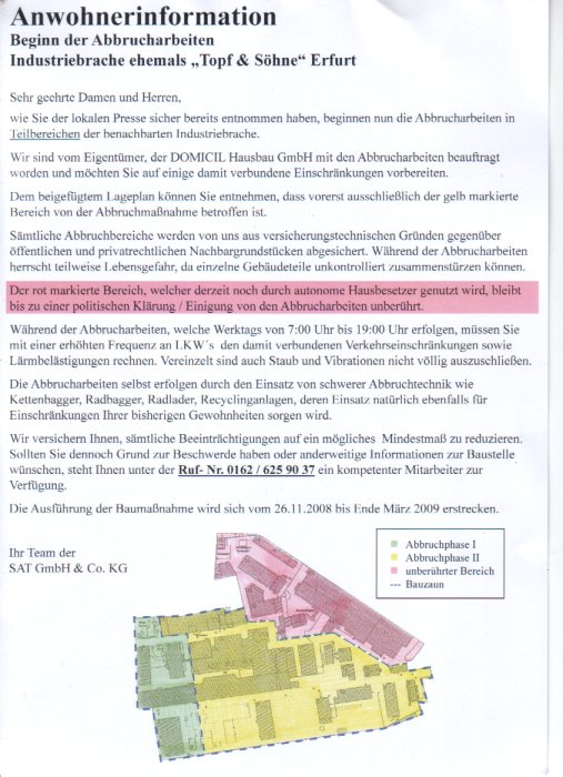 Die Domicil Hausbau Gmbh ließ uns am 8.1. einen Brief zukommen, in dem sie uns eine Frist setzt, den besetzten Teil des Geländes bis zum 21. Januar 2009 zu räumen. Anlass für die Maßnahme ist ein Schreiben des Erfurter Bauamtes vom 23.12.2008 an die Firma, in dem die "Nutzung von Gebäuden oder Freiflächen zum Zwecke der Durchführung von Veranstaltungen aller Art" mit sofortiger Wirkung untersagt wird. Erwähnt werden in dem Schreiben des Bauamts "Veranstaltungen wie Konzerte, Discos und Workshops". Die Versuche wie angekündigt eine "politische Klärung/Einigung" zu finden, werden mit einer drohenden Räumung mitten im Winter ad absurdum geführt.