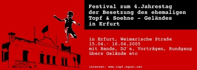 Letzte Woche wurde dem neuen Eigentümer des ehemaligen Topf & Söhne Geländes durch das Bauamt Erfurt ein Bescheid zugestellt, der ihn mit sofortiger Wirkung verpflichtet, alle Veranstaltungen auf dem Areal zu unterbinden. Als Begründung wurden bau- und nutzungsrechtliche Erwägungen sowie Sicherheitsbedenken angeführt. Eine Presseerklärung des besetzten Hauses findet ihr hier.