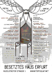 Das Programm für das "7-Jahre-besetzt-Festival" am 11./12.4.2008 ist fertig und kann hier betrachtet werden. Das Festival findet im besetzten Haus statt und wird für Freund_innen der Besetzer_innen organisiert.