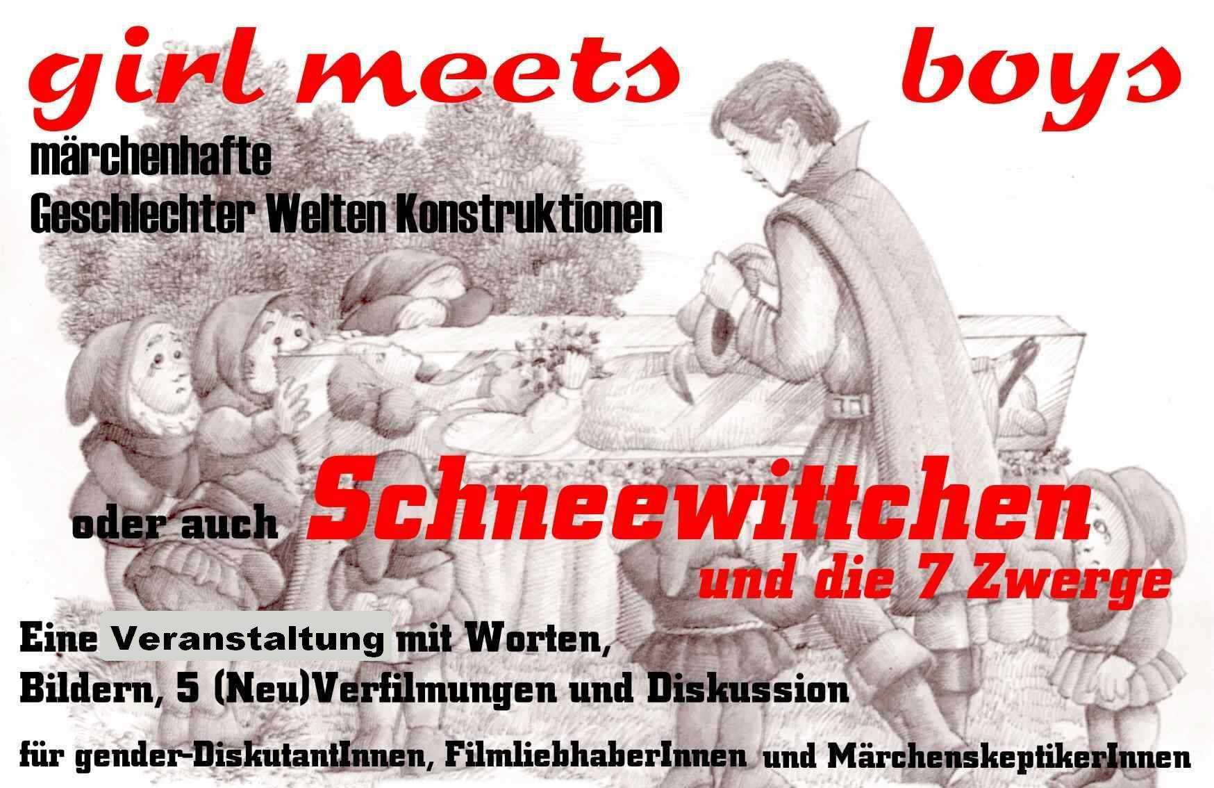 Aus einer Sammlung, die bisher pop-up Bilderbücher aus Polen, Deutschland, der Türkei, Frankreich und Japan sowie insgesamt 11 verschiedene Verfilmungen umfasst (von Disney über die Horror-Variante mit Sigourney Weaver bis zur Literaturverfilmung des Romans "Jakob van Gunten" von Robert Walser) lässt sich so ein breiter Einstieg in das vermitteln, was die patriarchale Gesellschaft für die Situation "girl meets boys" bereit hält. Die Konstitution von "Geschlecht" wird im Erstkontakt "der Frau" und "der Männer" wie unter einem Brennglas deutlich. Anhand der Verwandlung der geschlechtsindifferenten Zwerge zu Wesen mit "männlichen" Aufgaben kann das kulturübergreifende und doch kulturspezifische "doing gender" nachgezeichnet und der (dekonstruktivistischen) These des "doing sex" nachgegangen werden: "girl meeting creates boys" ?